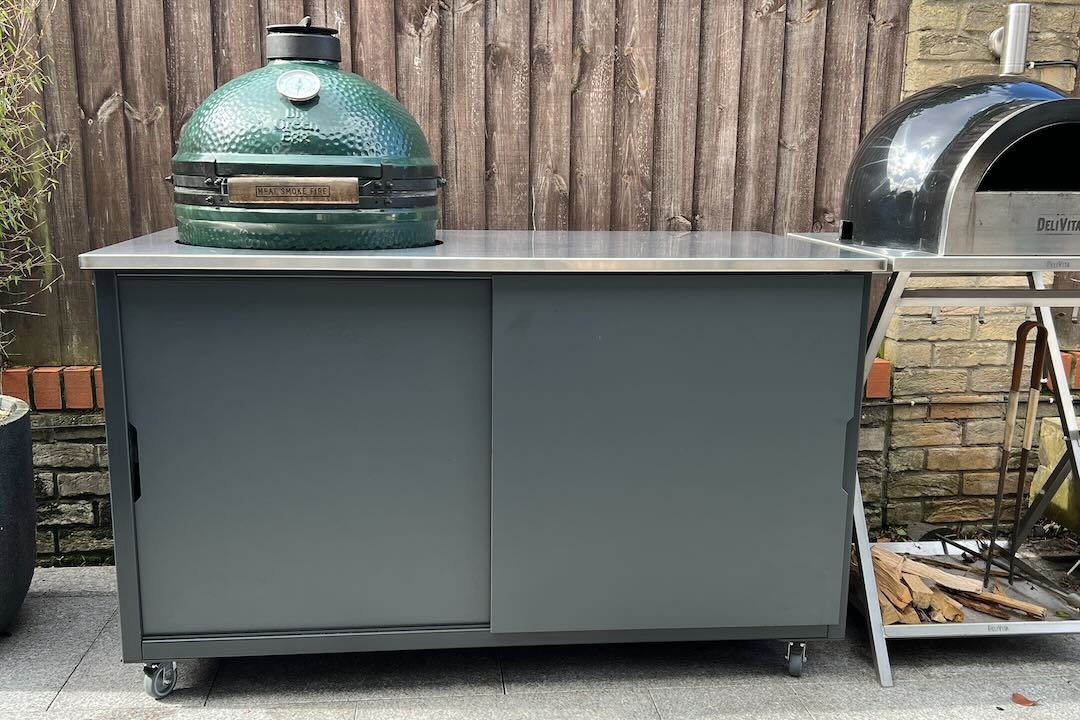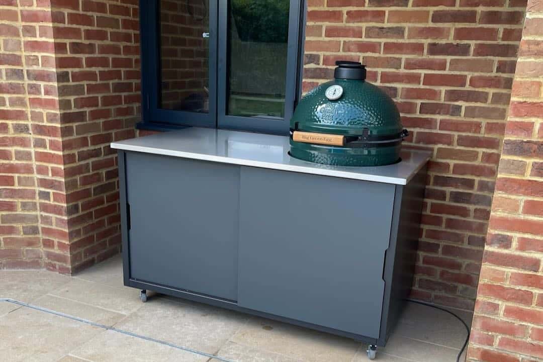 The island features a stainless steel work surface, giving you a hygienic work area on the right-hand side of your Big Green Egg or Kamado Joe.