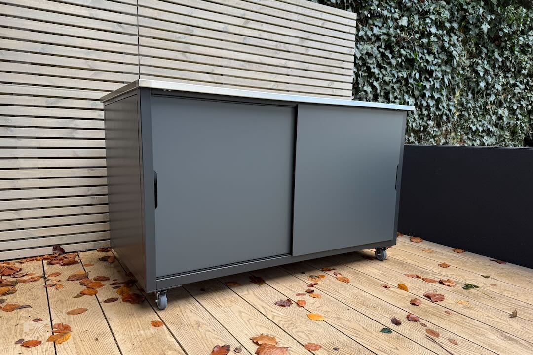 - There's so much weatherproof storage that can even keep charcoal hidden away and dry.