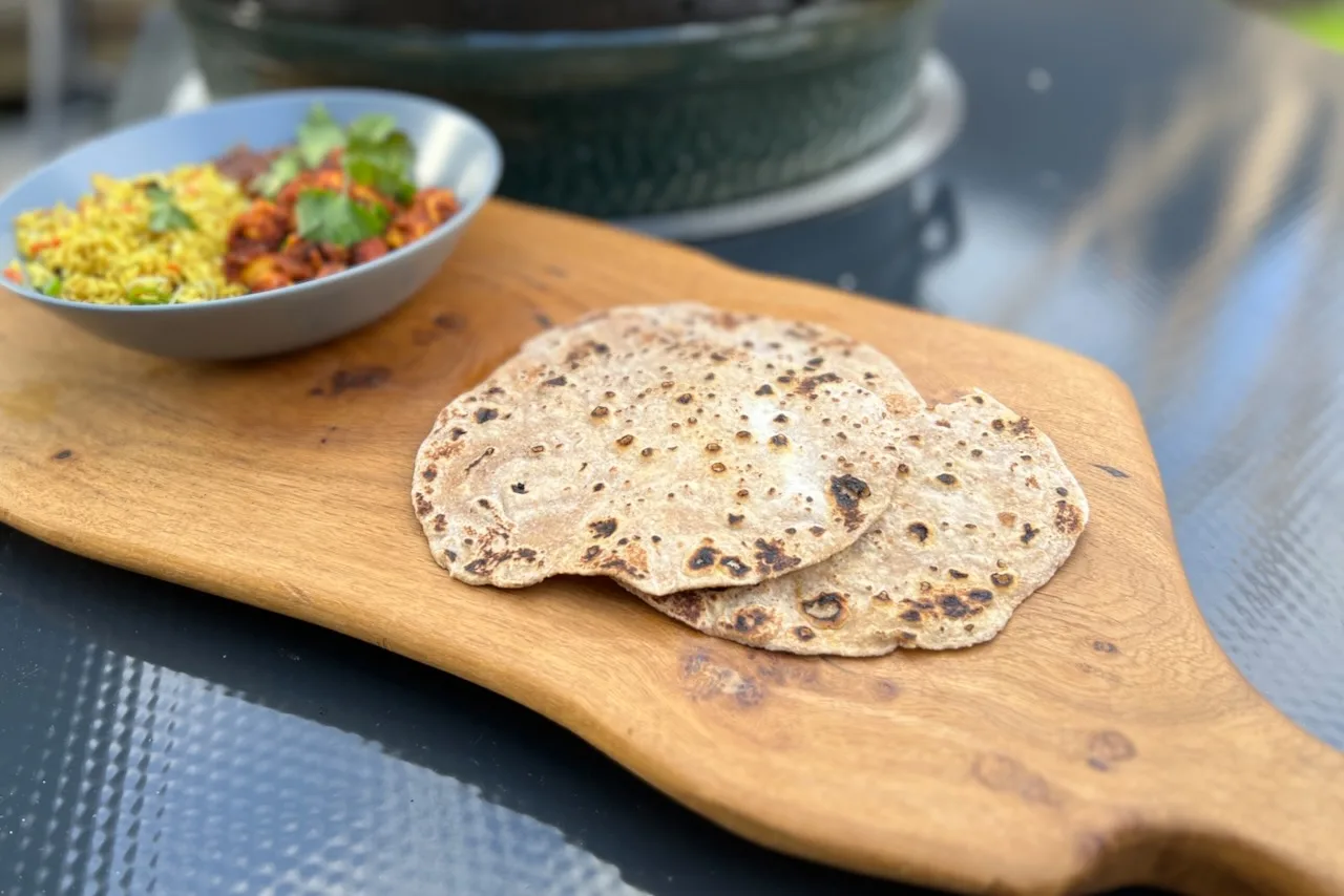 We used a tawa, traditional Indian flat pan on the MiniMax Big Green Egg but you can also use a non-stick fryng pan.