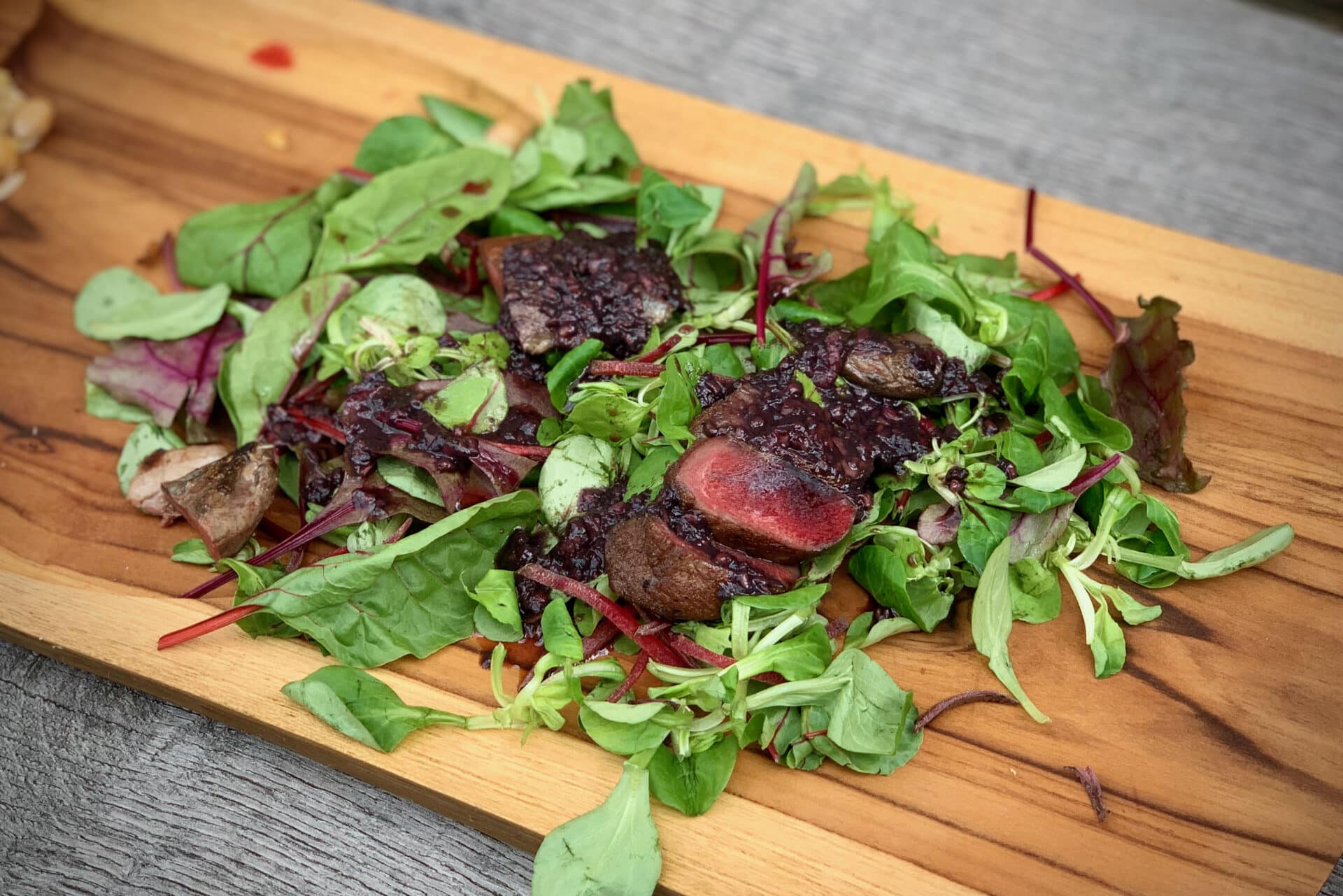 - Slice your pigeon breast on the bias and place ontop of a mixed green salad.