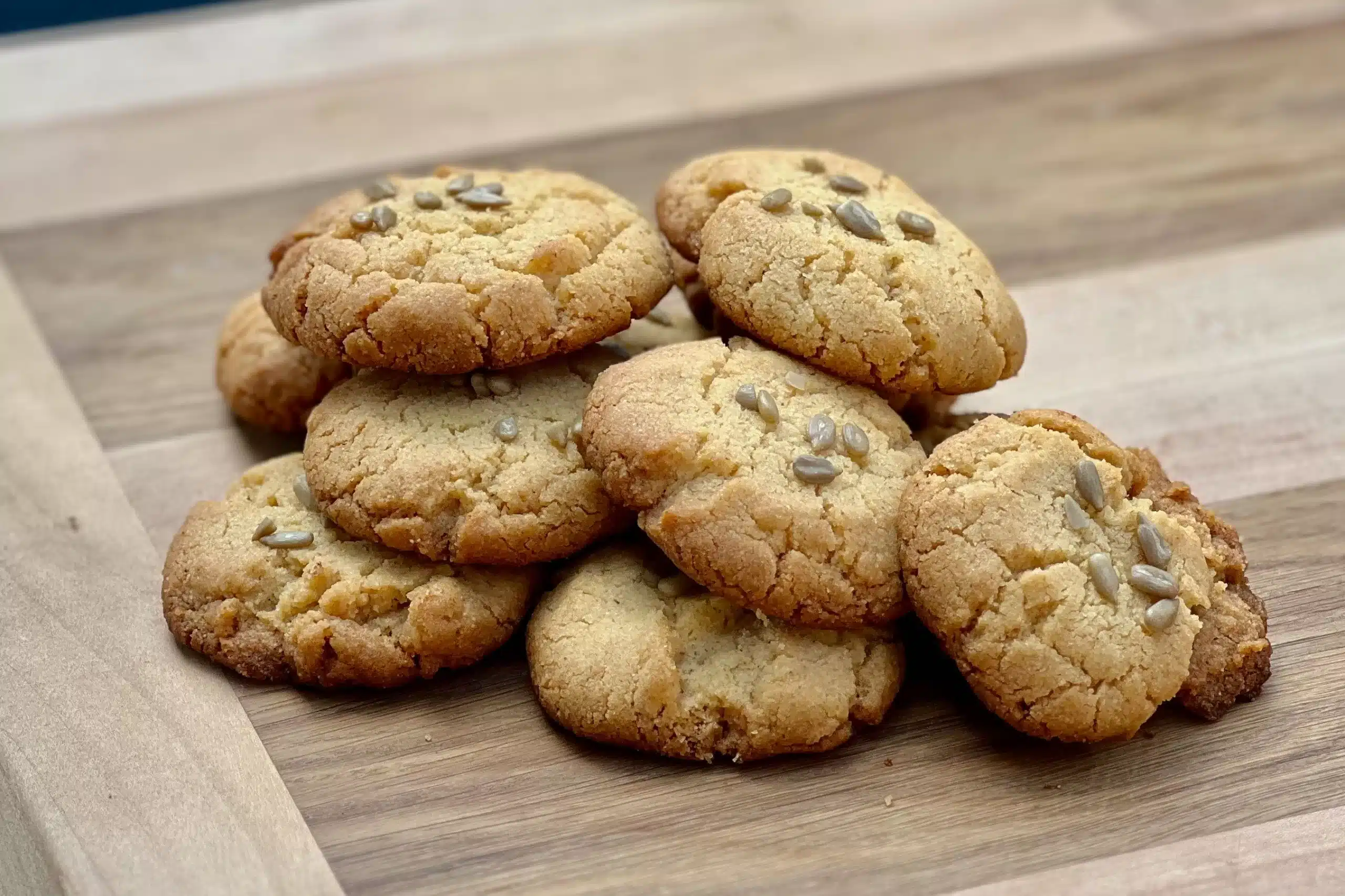 - Form small 25g balls of dough and place them onto the baking parchment. Push each ball down a little and sprinkle with the sunflower seeds.