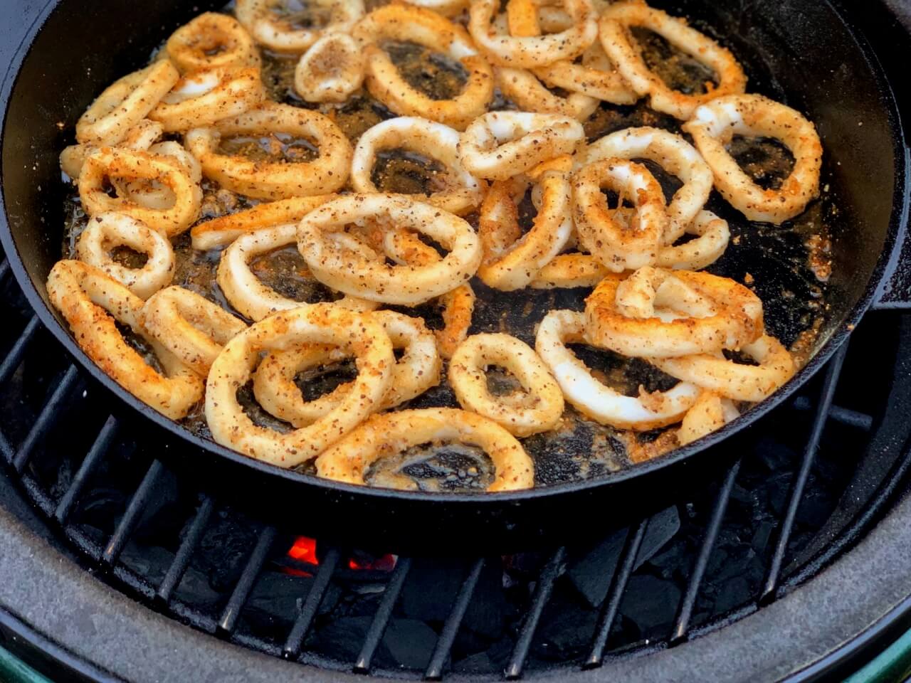 Squid, coated in a spiced flour of just salt and pepper, then shallow fried in cast iron. This very simple dish is absolutely delicious.