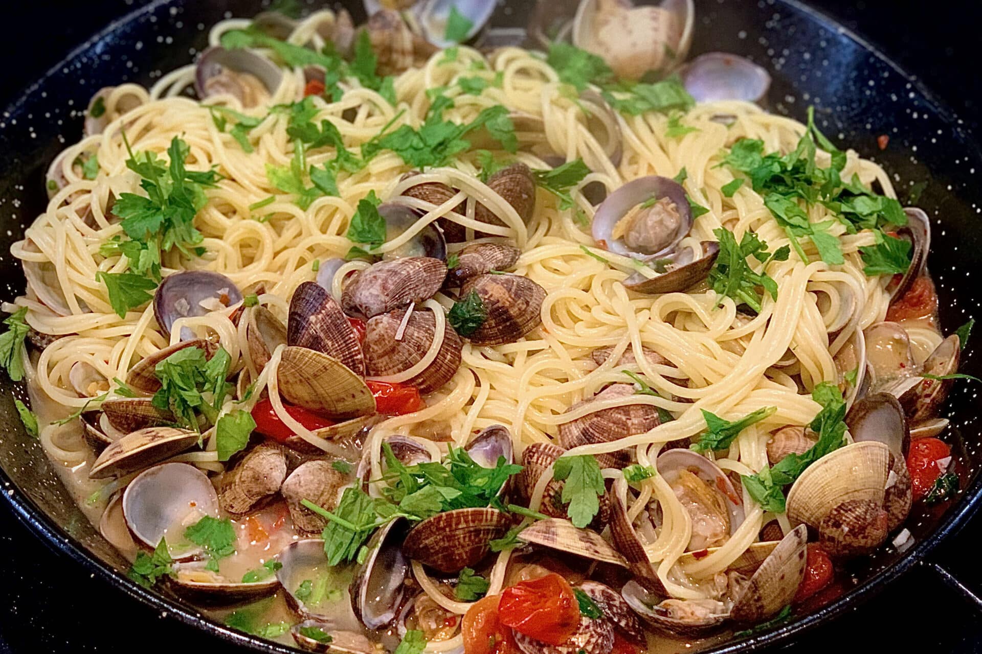 - Mix the clams through the pasta and serve in bowls with crusty bread.