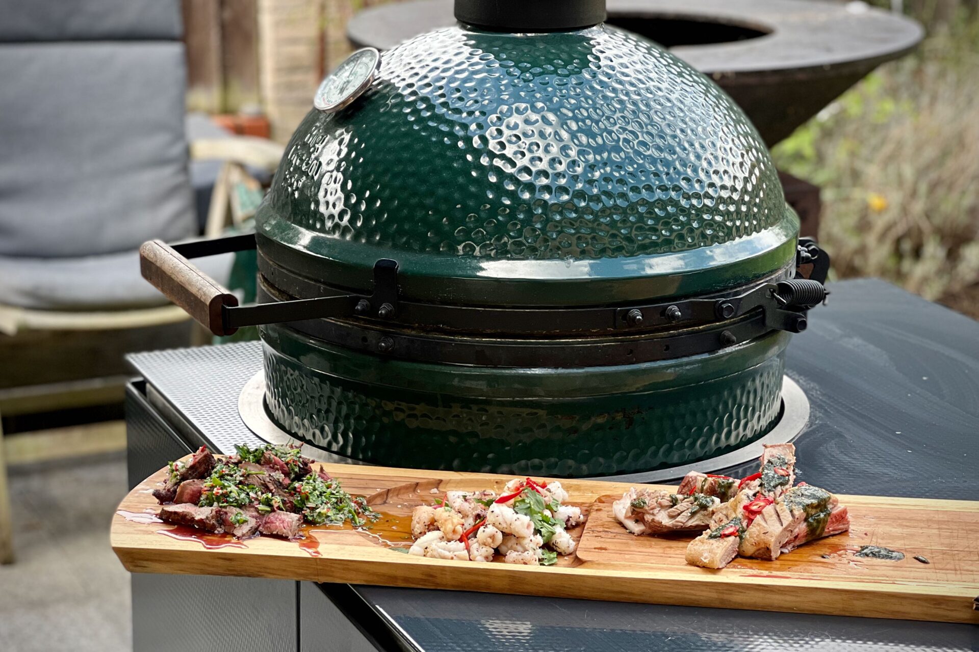 I was lucky enough to eat at High Grange Devon, where Luke and Sara run a superb outdoor cookery school. I went for a lunch with James Whetlor, the author of the Cooking on the Big Green Egg. Luke served a version of this squid recipe, and while he didn’t share the recipe, this is my take on it. He did let on that it contained MSG.