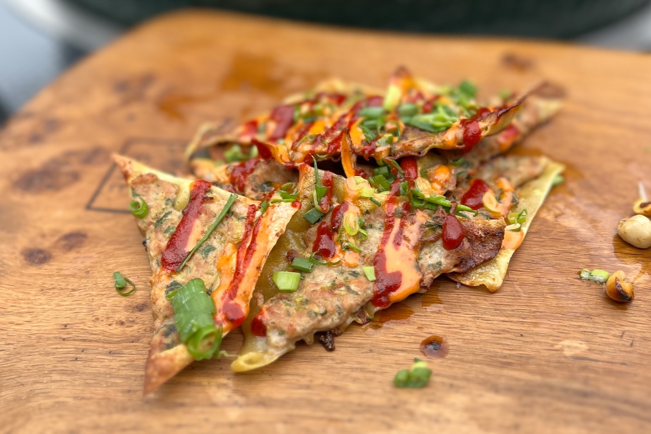 Nachos are typically made with tortilla chips. This dish is based on the flavours of pork dumplings and the texture of the nachos is created by crisping up the dumpling wrapper.