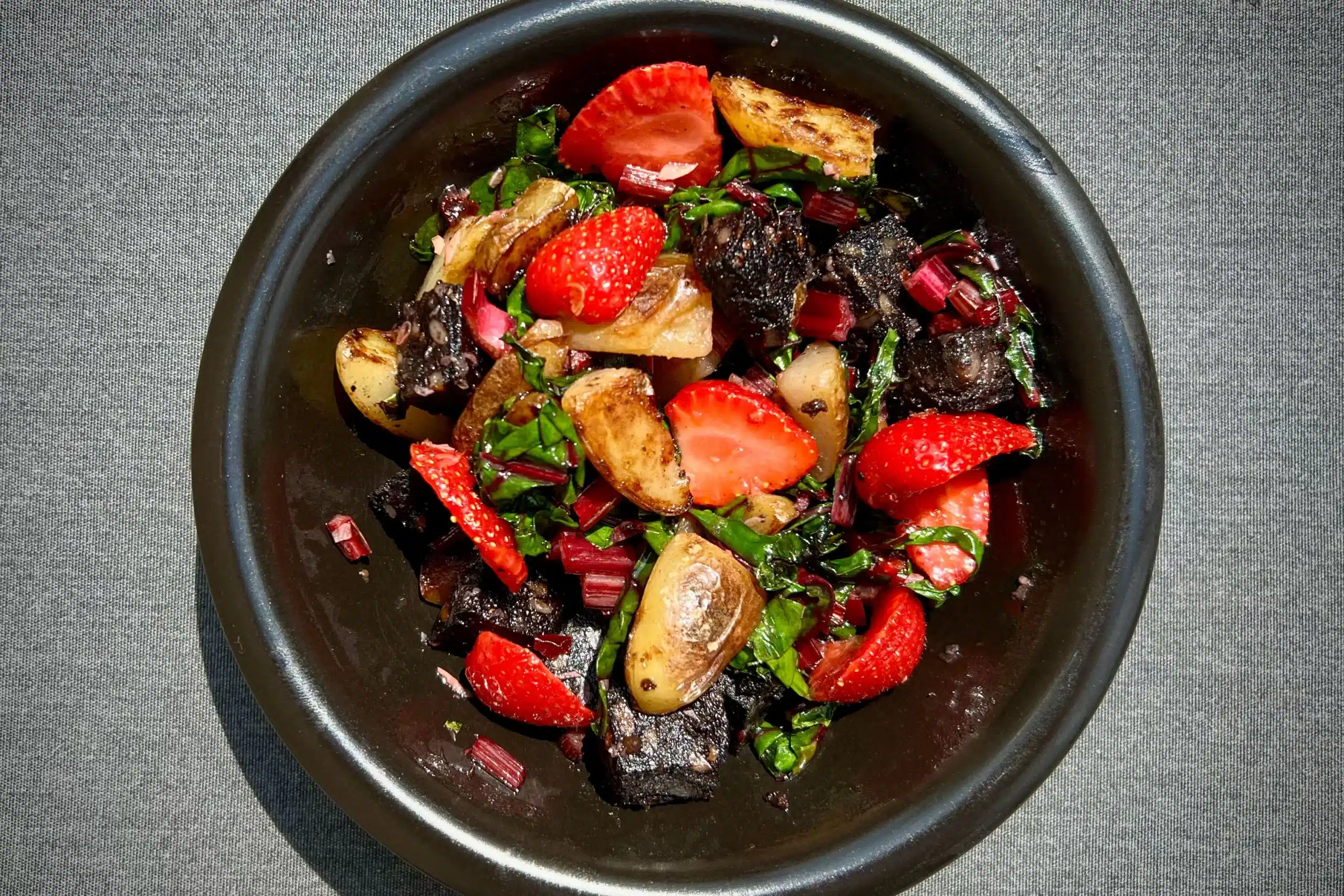 Chipotle pickled strawberries with black pudding, sautéed potatoes, and rainbow chard