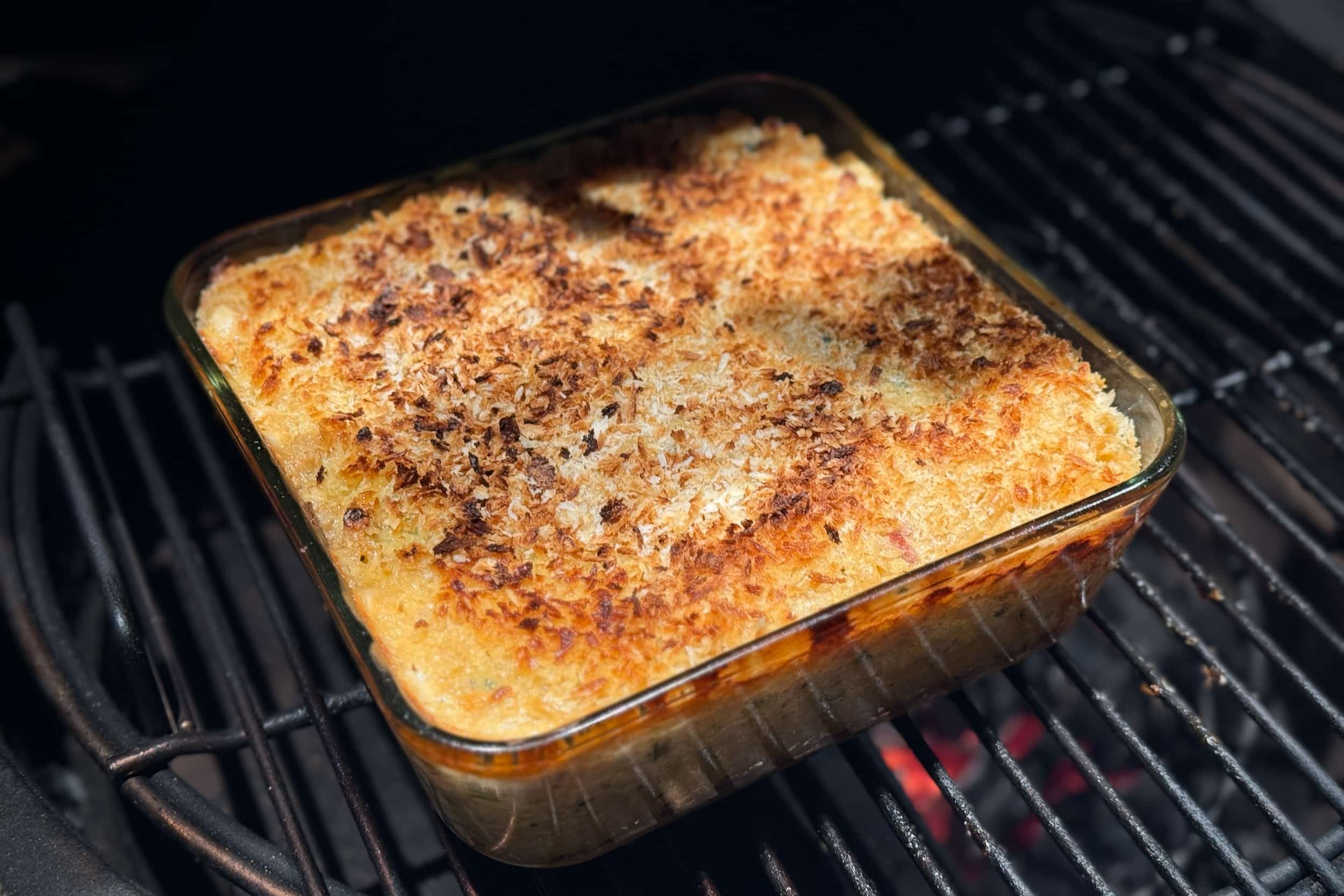 This dish is perfect as a side for grilled meats or as the star of the show. Cooked on the Big Green Egg, the dish is infused with a gentle kiss of smoky flavor, which pairs beautifully with the creamy, cheesy sauce.