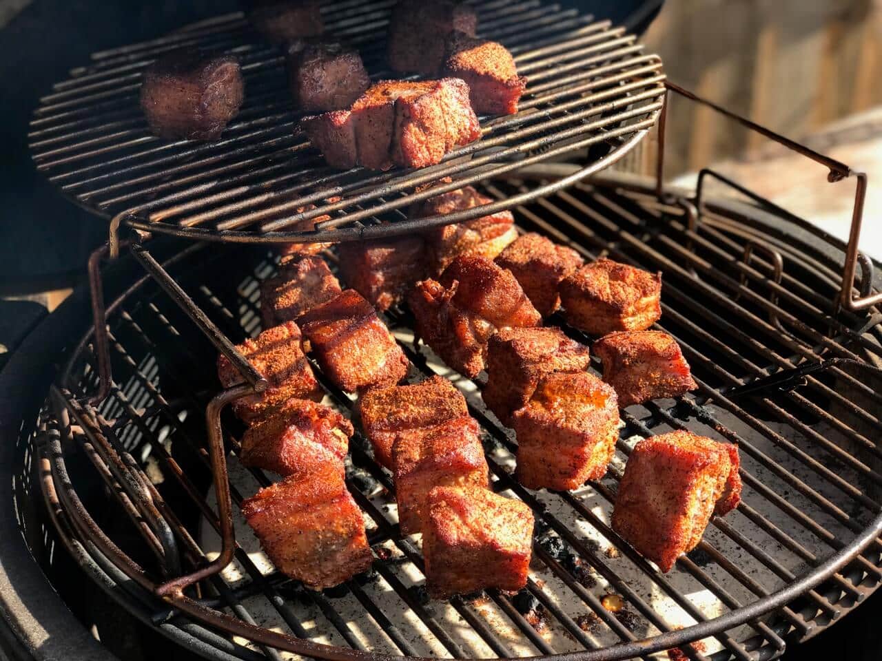 - Place your pork belly cubes onto the grid, making sure to leave a space between each of them.