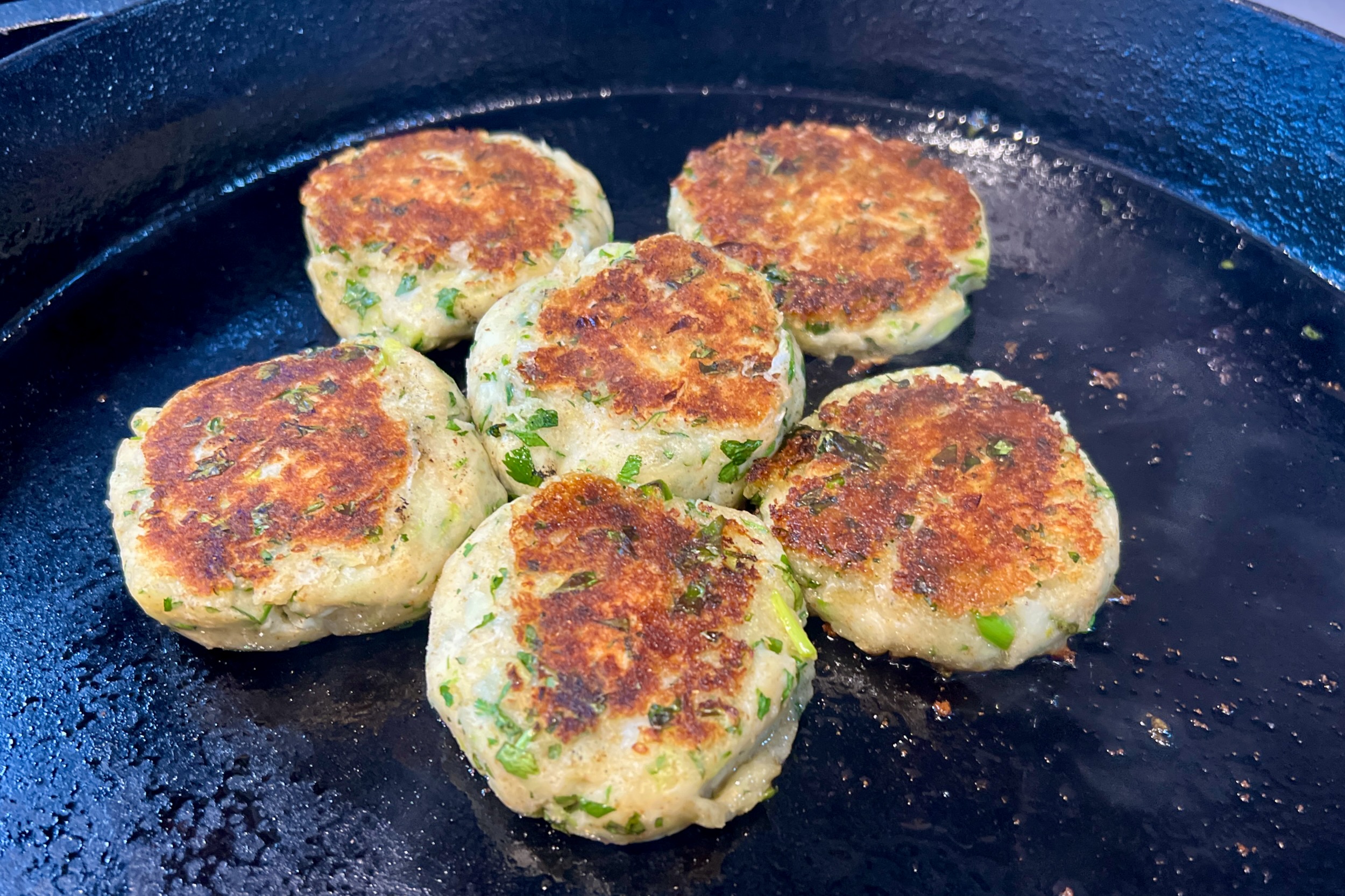 - Heat a cast-iron skillet on your Egg and when hot, add some oil and add 4 potato cakes to the pan. You’ll need to cook them in batches. They will take about 3 minutes each side, you’re looking for them to be golden brown and crisp.