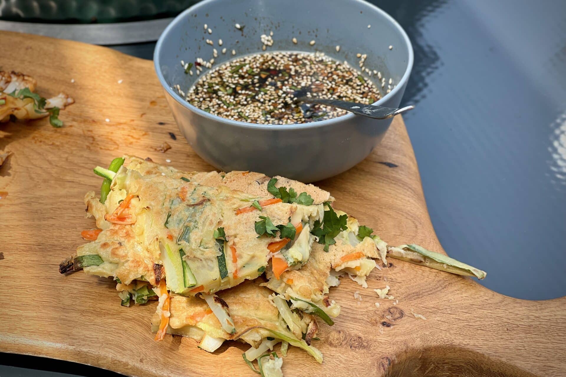 Who doesn’t love a pancake? We normally make savoury pancakes for Shrove Tuesday with a filling of creamy pepper and mushroom with loads of black pepper. These though aren’t filled, the vegetables are baked into the batter and the thick pancake is then sliced into handheld portions to dip into a spicy dipping sauce.