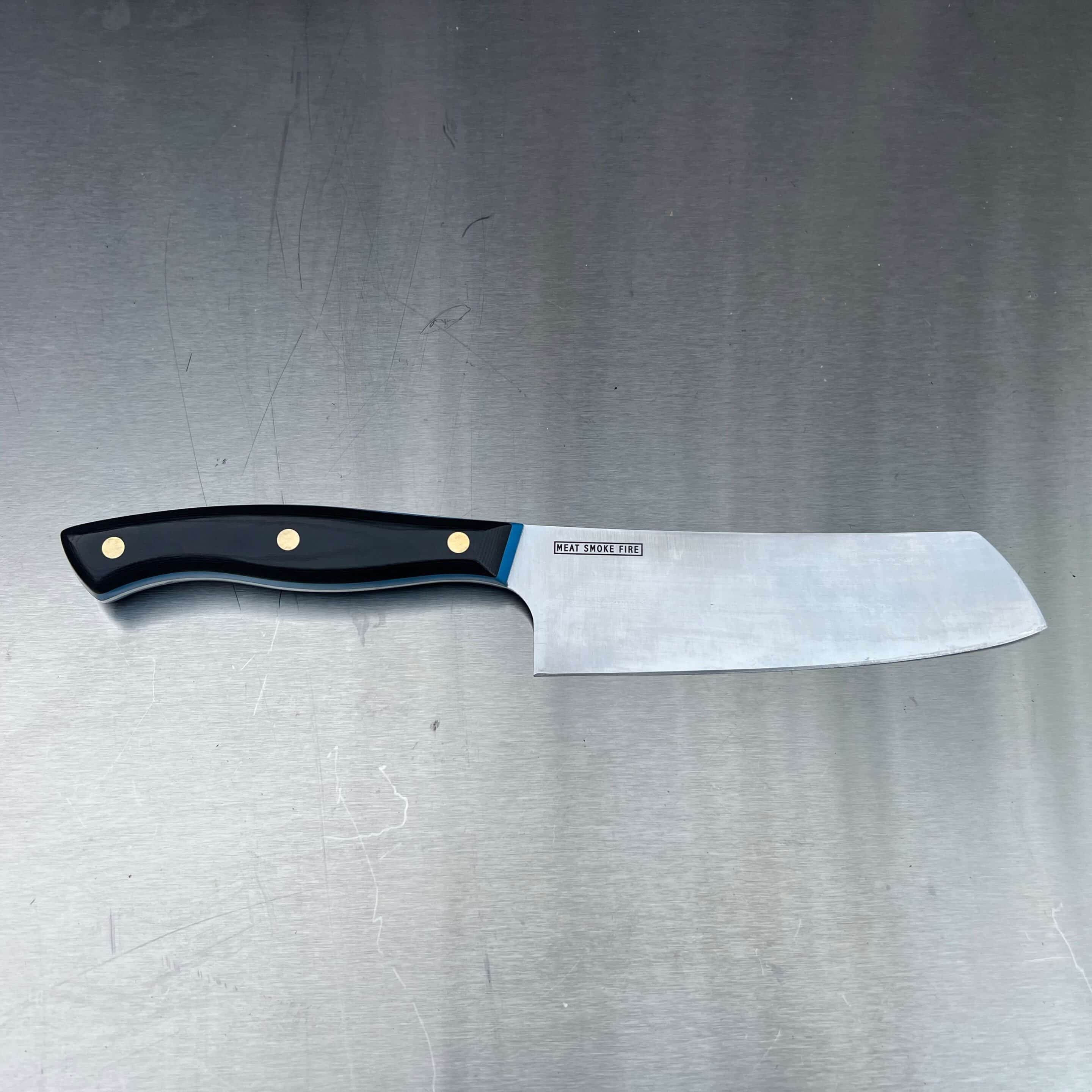 Each knife features a subtle, engraved Meat Smoke Fire logo on the right hand side of the blade.
