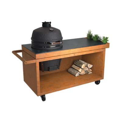 The OFYR Kamado Table 150 PRO is available in Corten steel. This unit combines the art of kamado cooking on a Big Green Egg with the classic OFYR design.